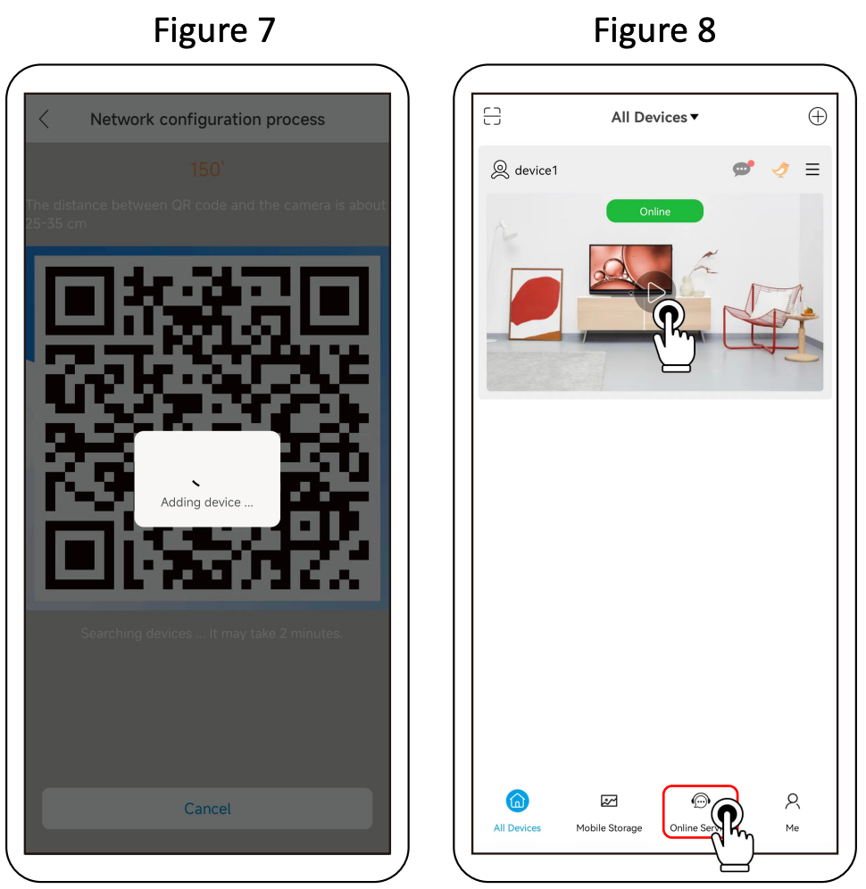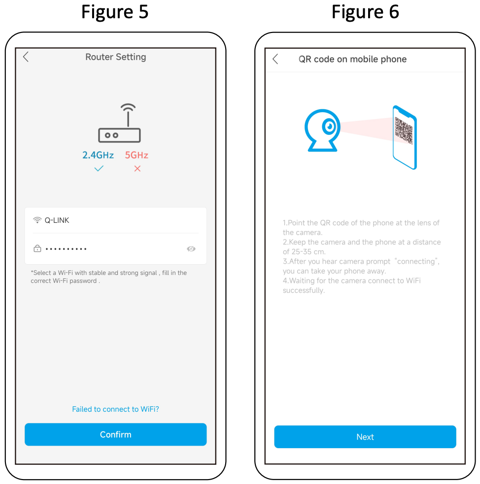Your phone will generate a QR code, place the QR code in front of the camera about 25-35cm (about 1 ft) as shown in Figure 6, wait for the configuration to complete as shown in Figure 7.