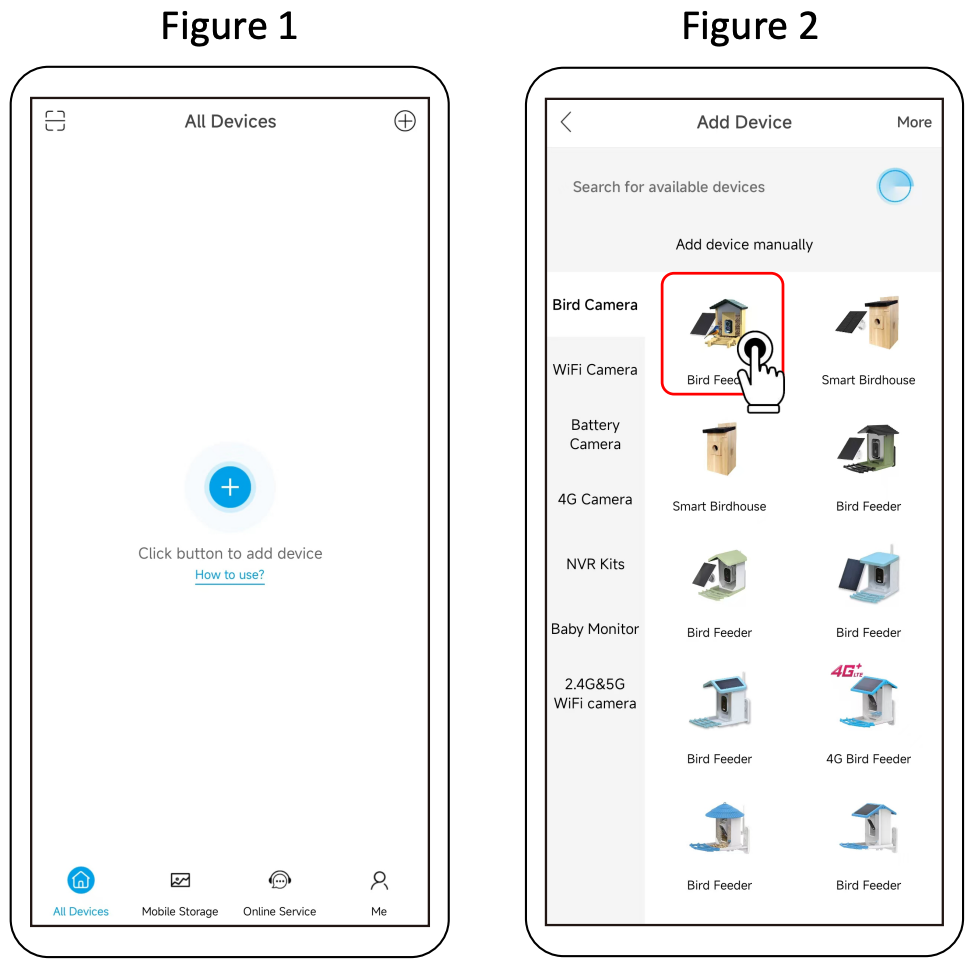 Click "+" in the middle of the APP interface or "+" in the upper right corner to add device as shown in Figure 1, select bird feeder as shown in Figure 2.